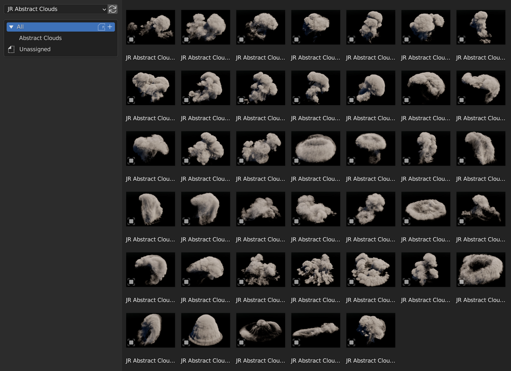 This asset pack provides a collection of very high resolution, high quality VDB files that represent abstract cloud shapes. They are formatted for use with Blender’s Asset browser. I wanted volumes that stand up to scrutiny when rendered up close and at high resolutions (e.g. 4000-5000px in width or height), so they are designed for that purpose.